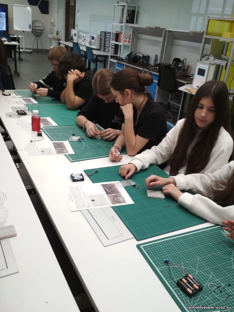 По прибытию ребята посетили кабинет физической лаборатории, где их познакомили с элементами электрической цепи, их условными обозначениями и с правилами по безопасности при сборке электрических цепей. После последовал мастер класс, где они самостоятельно под руководством наставника собирали цепь сигнализации с использованием светодиода и пьезоэлемента.